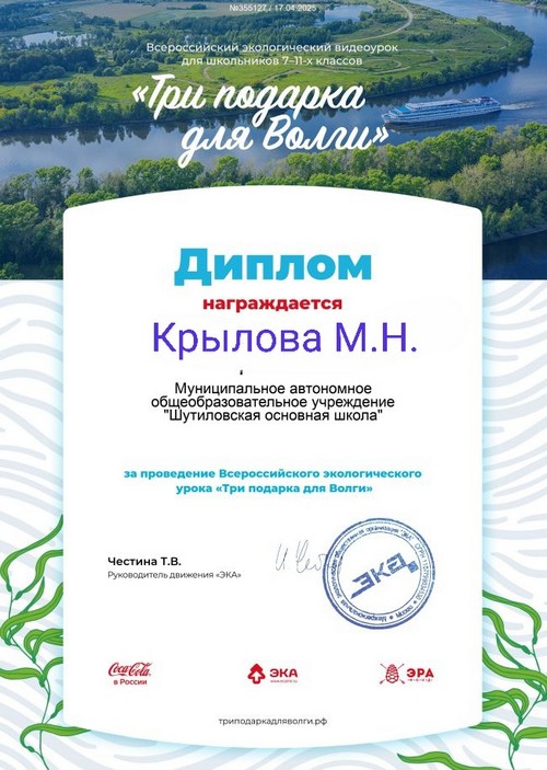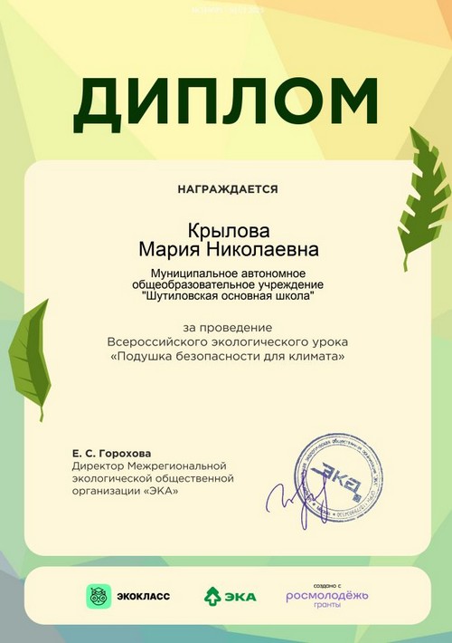 По итогам урока Крылова М.Н. была удостоена диплома за активное участие и высокое качество проведения экологического урока, а МАОУ «Шутиловская ОШ» получила благодарственное письмо за содействие в реализации этого важного мероприятия.
