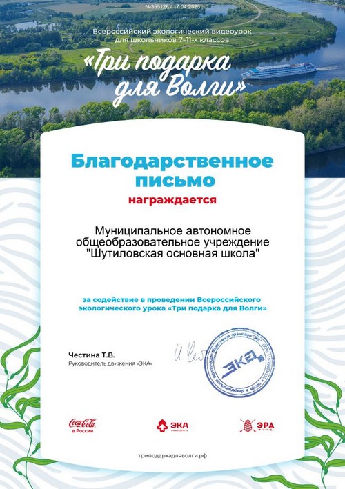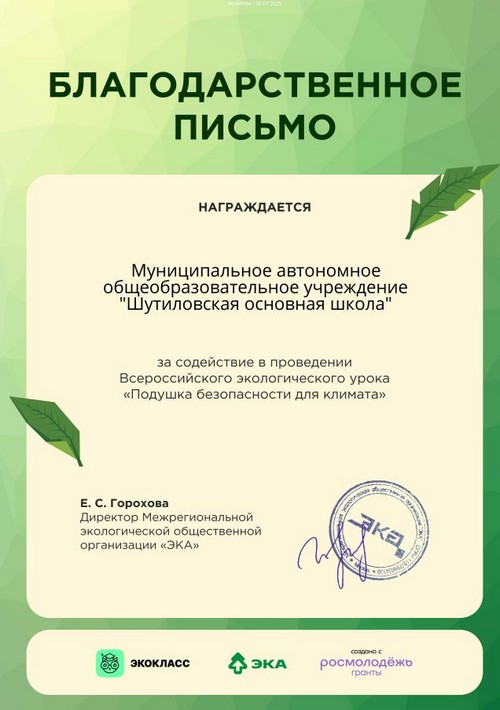По итогам проведения экоурока учителя наградили дипломом за проведение Всероссийского экологического урока «Подушка безопасности для климата», а МАОУ «Шутиловская ОШ» наградили благодарственным письмом за содействие в проведении Всероссийского экологического урока «Подушка безопасности для климата».