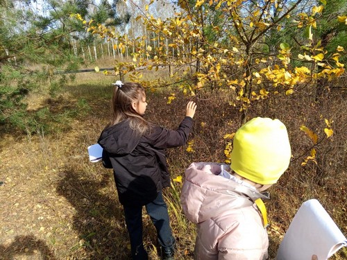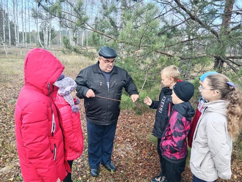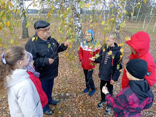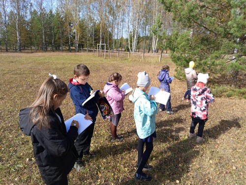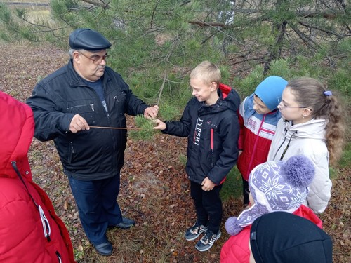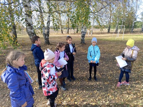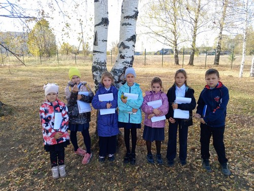 Погода была отличной: тепло, сияло солнышко. До чего же красив осенний лес! Деревья стоят зелёные, жёлтые. Воздух чист и свеж, с запахом опавшей листвы. Катихина Л.В. рассказала младшим школьникам о жизни в осеннем лесу.