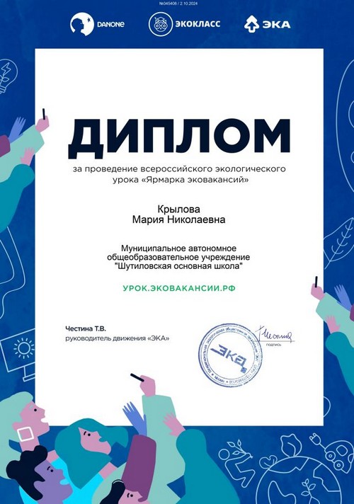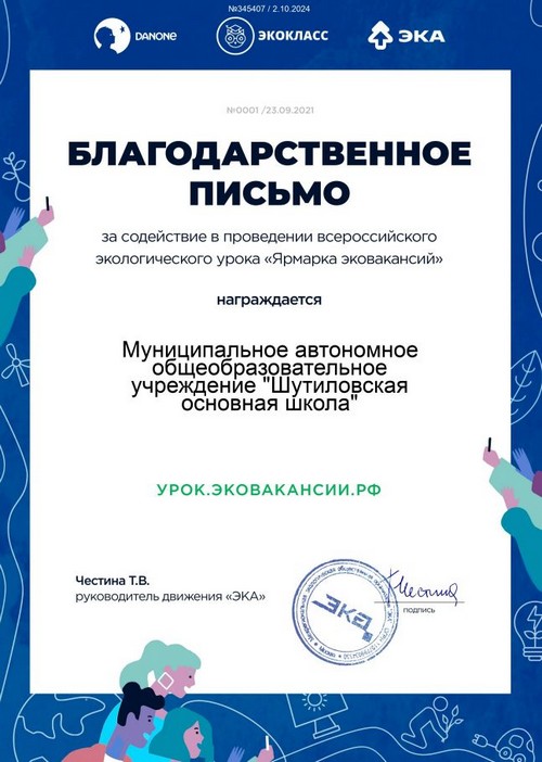 По итогам проведения экоурока учителя наградили дипломом за проведение Всероссийского экологического урока "Ярмарка эковакансий", а МАОУ "Шутиловская ОШ" наградили благодарственным письмом за содействие в проведении Всероссийского экологического урока "Ярмарка эковакансий".