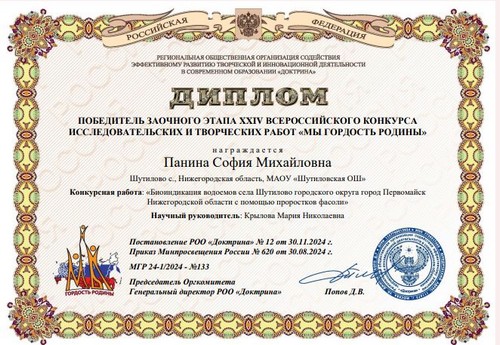София совместно со своим научным руководителем Крыловой М.Н. подготовили учебно-исследовательскую работу на тему "Биоиндикация водоемов села Шутилово с помощью подростков фасоли".