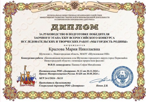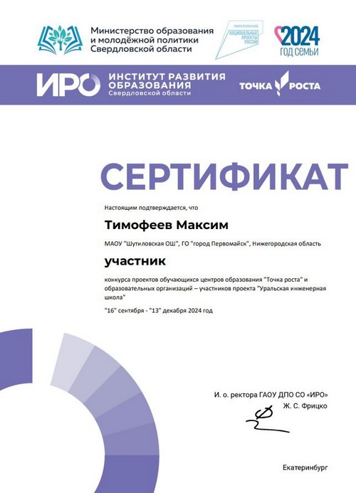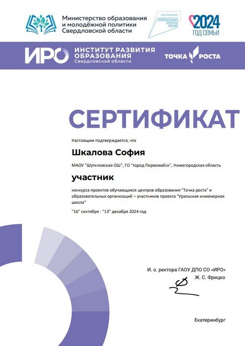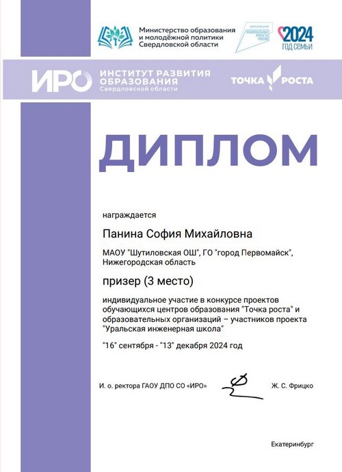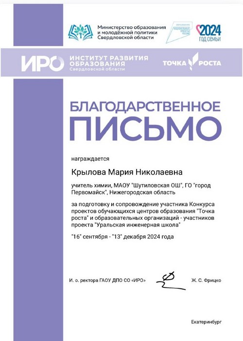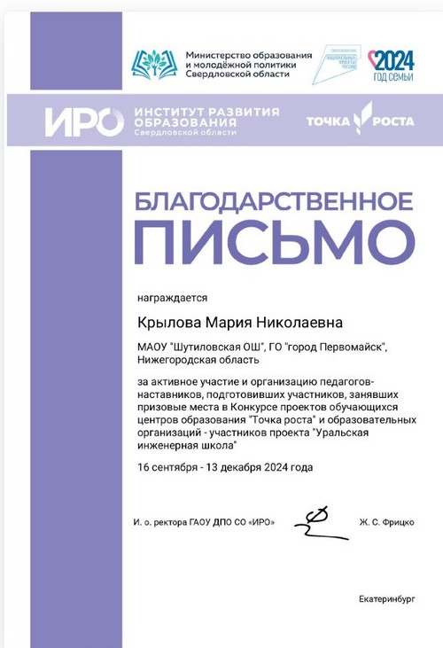 Крылову Марию Николаевну, руководителя Центра образования естественно-научной и технологической направленностей «Точка роста» Шутиловской основной школы, наградили благодарственным письмом за активное участие и организацию педагогов-наставников, подготовивших участников, занявших призовые места в Конкурсе проектов обучающихся центров образования «Точка роста» и образовательных организаций – участников проекта «Уральская инженерная школа».