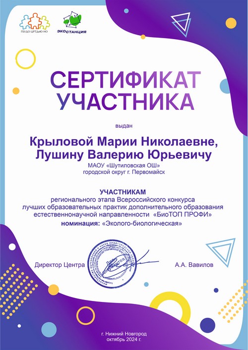 Крылова Мария Николаевна и Лушин Валерий Юрьевич, учителя биологии и химии Шутиловской основной школы, стали участниками регионального этапа Всероссийского конкурса лучших образовательных практик дополнительного образования естественнонаучной направленности «БиоТОП ПРОФИ» в форме «Дополнительная общеобразовательная программа естественнонаучной направленности» в номинации «Эколого-биологическая»
